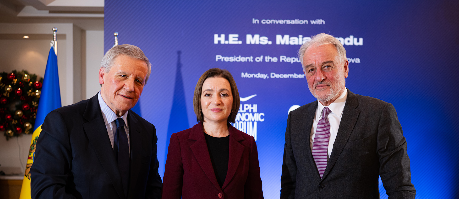 On the occasion of the Working visit of the President of the Republic of Moldova, H.E. Ms. Maia Sandu, the President of the Republic of Moldova, the Delphi Economic Forum and the Hellenic Foundation for European & Foreign Policy (ELIAMEP) hosted an In Conversation meeting which took place at the Athens Club on Monday, December 15, 2025.